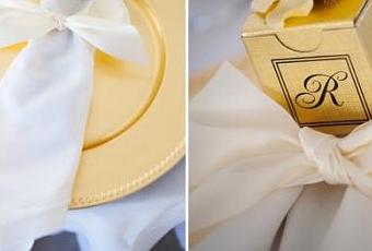 Décidément, le jaune se marie parfaitement bien avec le doré: de magnifiques boites a dragées dorées décorent délicatement une table ravissante blanche et jaune: l’or se mele aux couleurs estivales et s’accommode plutot bien a cette scene de mariage chic.