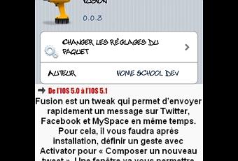 Fusion est un tweak qui va vous permettre d’envoyer un message sur Twitter, Facebook et MySpace en même temps. Pour cela, il vous faudra après installation, définir un geste via Activator pour « Composer un nouveau tweet ». Une fois ce geste fait, une fenêtre pop-up apparaitra vous proposant d’écrire une nouvelle phrase sur Twitter.