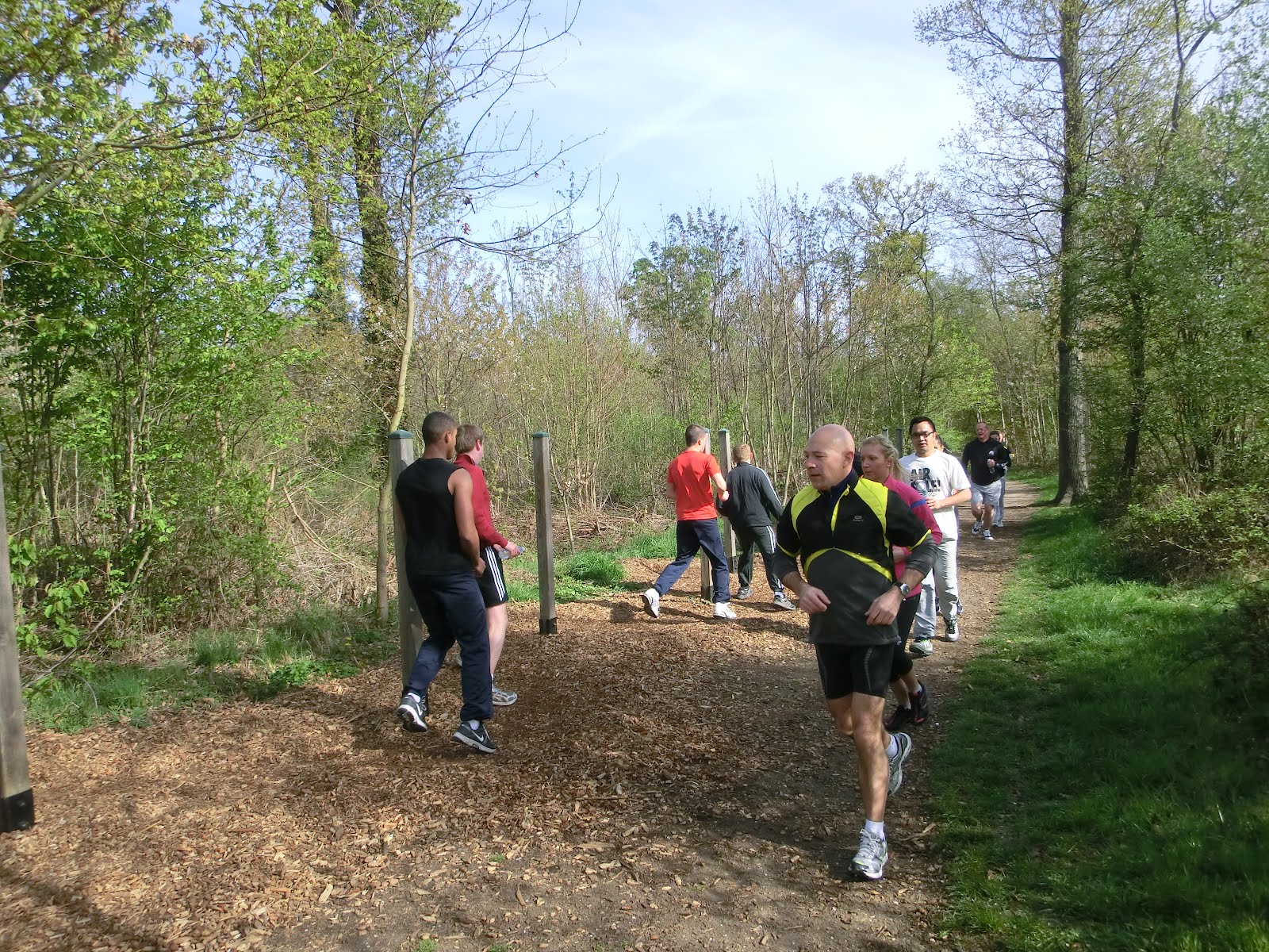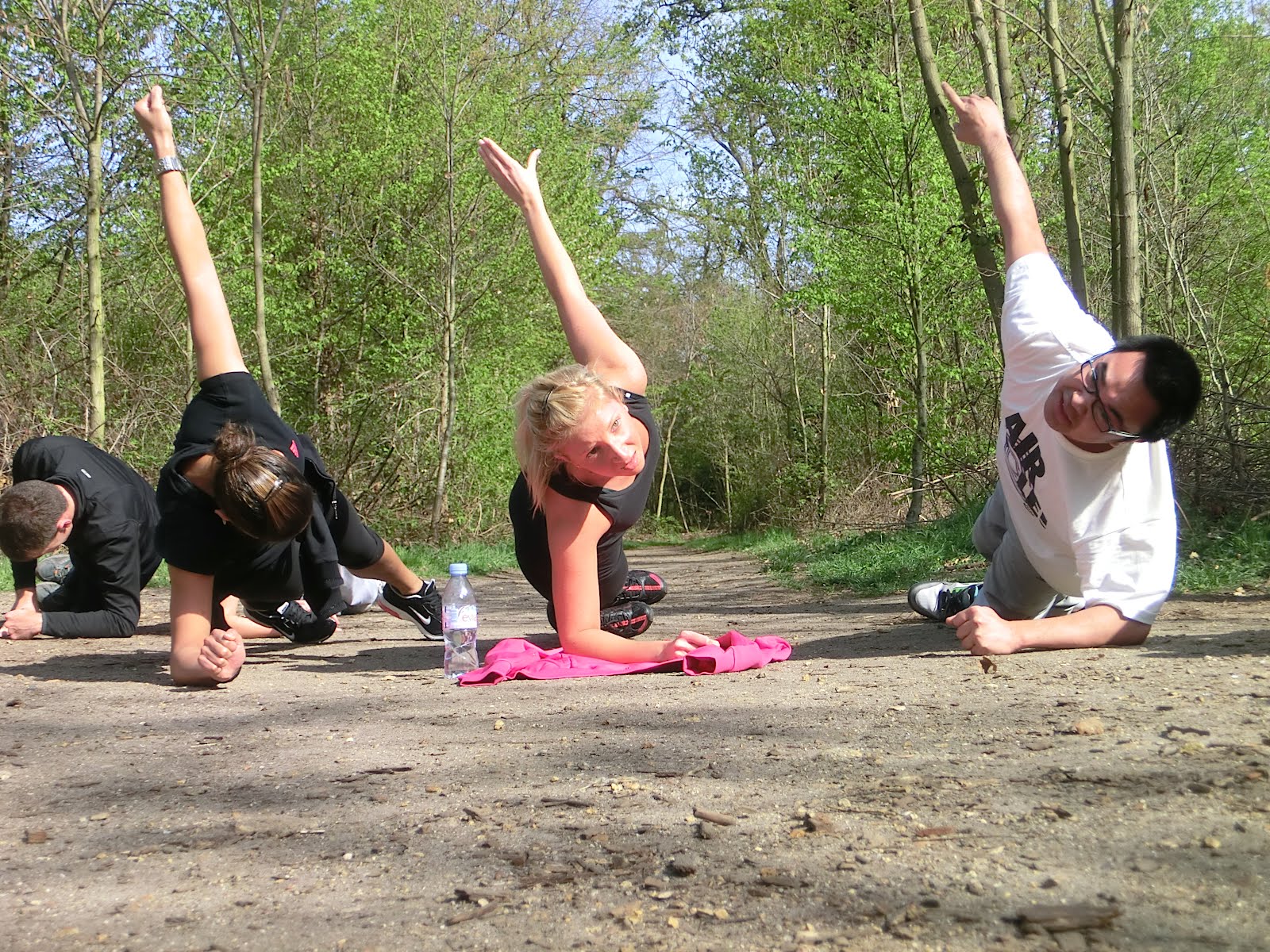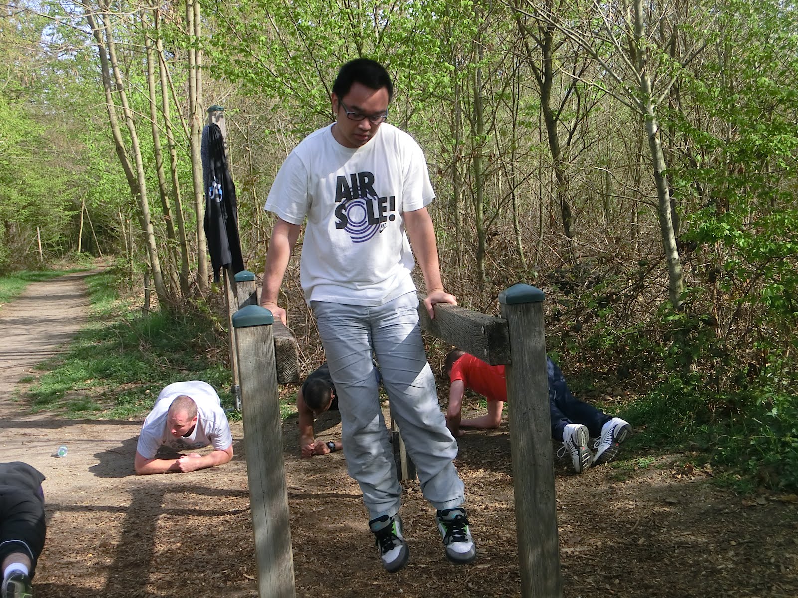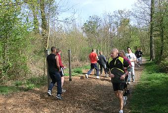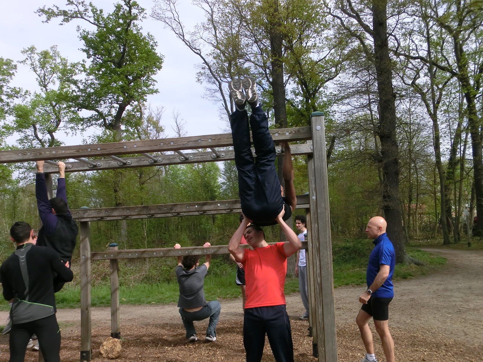 La troupe longe le château de Vincennes, se déleste de ses sacs ou vêtements encombrants pour rallier la forêt et le parcours sportif en footing ponctué de talons-fesses et de lever de genoux. Le premier atelier est tout simple, zigzaguer entre des poteaux... mais le coach ajoute un final plus corsé : des pompes à son rythme... en bas, en haut, au milieu, en bas, à droite, à gauche !