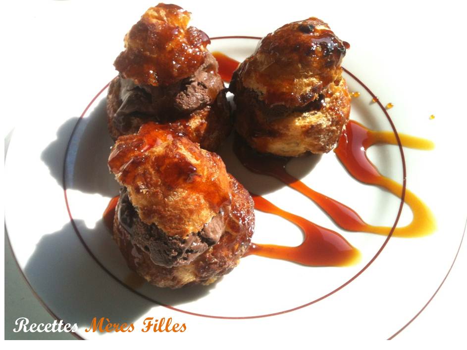 Au moment de servir, remplissez chaque chou d’une boule de glace et remettez le chapeau par-dessus. Répartissez dans les assiettes les choux et versez la sauce caramel beurre salé dessus.