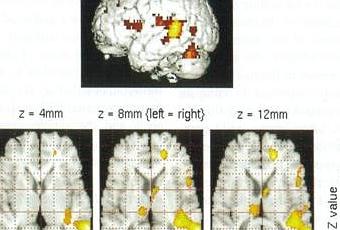 Figure: Identification des sites de l’activité neurale spontanée associée aux acouphènes chez 3 patients présentant un acouphène subjectif dans l’oreille droite. (LOOKWOOD, SALVI et al. Scand audiol, 1999) Le site principal de l’activité est retrouvé dans le gyrus temporal moyen gauche (en haut). Les 3 plans transaxiaux montrent les mêmes résultats dans des plans 4, 8 et 12 mm en dessous du plan défini par les commissures antérieures et postérieures. Le site d’activation s’étend ici jusqu’au cortex operculaire.