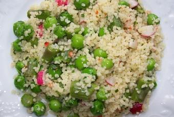 - Incorporer à la semoule les queues et les têtes d'asperges en petits morceaux, les radis en tranches fines, puis délicatement les petits pois.