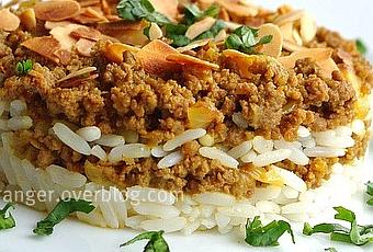 Dresser le plat chaud en alternant en deux couches riz et viande, finir par une petite couche d'amandes éffillées.
