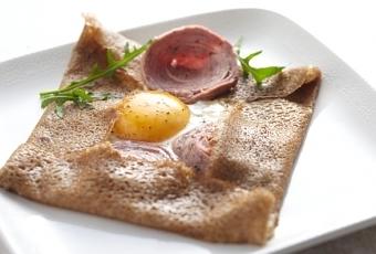 5 - Pour une galette complète, beurrer généreusement les deux côtés de la galette et déposer au centre de l'un des deux, du jambon et de l'emmental râpé, puis casser un oeuf au centre de la galette.