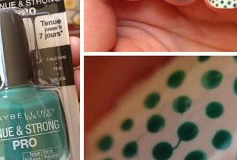 J’ai simplement posé le vernis avec en accent nail une base blanche (opi) et des pois du gemey.