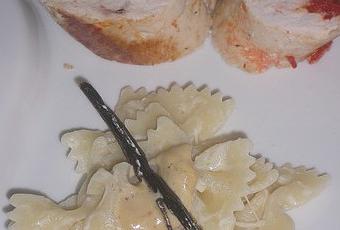 après que la gousse de vanille a macerer dans la crème je l'ai mise dans l'eau de cuisson des pâte et j'ai adoré ce goût , une association bien exotique qui nous emporte bien loin.