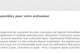 Cette mise à jour configure également le module web Java pour désactiver l’exécution automatique des applets Java. Les utilisateurs peuvent réactiver leur exécution dans l’application Préférences Java. Si le module web Java détecte qu’aucun applet n’a été exécuté depuis longtemps, les applets Java seront à nouveau désactivés.