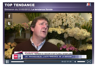 En moins de 2 minutes Le grand fleuriste Gilles Pothier, M.O.F., champion du monde, membre du Groupe d'Art Floral Interflora nous donne la tendance fleurs pour ce printemps 2012.