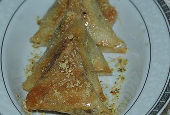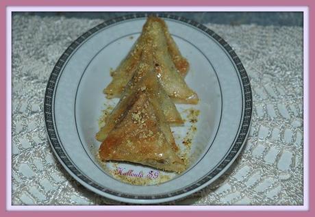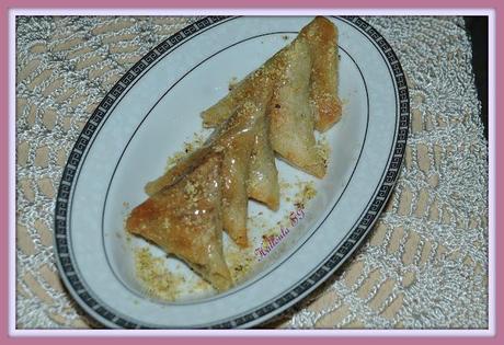 * Mesurez les fruits secs et ajoutez la moitié de cette quantité en sucre ( si vous avez 50g de fruits sec broyés mettez 25g de sucre )* Ajoutez petit à petit l'eau de fleur d'oranger pour avoir un pâte homogène* Prenez les feuilles de malsouka, coupez les extrémités pour avoir des rectangles* Mettez un peu de la farce et formez des triangles ( pour ceux qui ne savent pas la technique vous la trouverez dans ce site )* Mettez les dans un plat et badigeonnez avec un pinceau avec de beurre fondu* Préchauffez le four à 180° et mettez les "samsas" jusqu'à ce qu'elle prennent couleur sortez et laissez froidir* Préparez le sirop: mettez le sucre et l'eau sur un feu moyen afin d'obtenir un sirop un peu léger et ajoutez en fin un peu d'eau de d'oranger* Mettez les "samsas" dans le sirop, enrobez les de ce sirop et laissez encore froidir* Vous pouvez les saupoudrez de pistache ou noisette ou sésame.