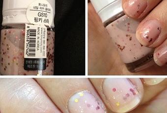 Il donne un aspect lacté aux ongles ( mes ongles en mieux lol) et parsème délicatement quelques paillettes de différentes tailles et de différents couleurs ( rose, rouge, doré, violet….)