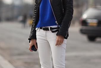 - Le bleu électrique porté avec un jean blanc