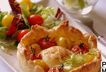 Posez un crottin au centre de chaque moule et répartissez les tomates cerises tout autour.