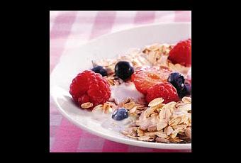 - Bien mélanger le miel et le lait fermenté , puis incorporer les fruits. Dresser le mélange à base de flocons d'avoine dans des assiettes, puis napper de fruits et de lait.