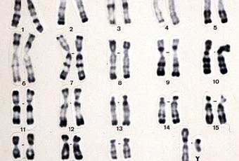 Caryotype humain mâle : on reconnaît un chromosome Y à côté du chromosome X.