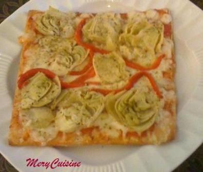 4 croûtes à pizza précuites ou 4 pains pitas grecques, 250 ml (1 tasse) de sauce à pizza 4 cœurs d’artichauts marinés, égouttés et tranchés200 g de poivrons rouges grillés coupées en lanières200 g de mozzarella fraiche, tranchée fines2 c à c de thym séchéHuile d’olive extra viergeMéthodePréchauffer le four à 400°F (200°C)