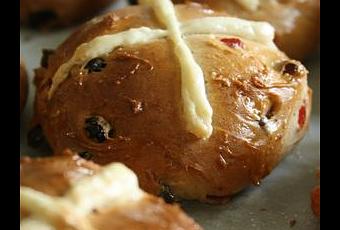 En Angleterre la tradition veut que pour Pâques l'on mange ces petits pains fruités, d'où la croix sur le dessus. Ceci dit on en trouve maintenant tout au long de l'année dans les commerces. Cette année, j'ai voulu essayer moi-même...