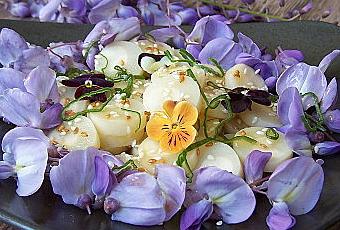 Dressez dans les assiettes les coeurs de palmier au centre et entourez-les de fleurs de glycine, parsemez de graines de sésame et de quelques pensées.