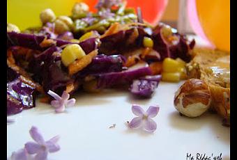 Couper le chou rouge en fine lamelle. Eplucher les carottes et les râper. Mélanger le chou rouge, les carottes, le maïs, les huiles de colza et de noix, le jus du demi-citron et le sel. Faire griller les tranches de pain. Passer les noisettes à la poêle à sec et réserver. Déposer un demi Rocamadour sur chaque tranche de pain et passer quelques secondes au micro-ondes. Dresser l'assiette avec la salade et les tranches de pain. Puis décorer avec les asperges, les noisettes et les fleurs de lilas.