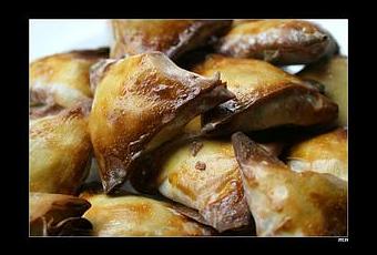 Mettre de la farce sur l'extremite gauche. Rabbatre le bas vers le haut, de telle sorte a recouvrir la farce. Apres, il suffit de rabbatre l'angle du haut vers le bas, puis du bas vers le haut et ainsi de suite. A la fin il vous reste un petit morceau de pate qui depasse, il suffit de le coincer dans le triangle (vous verrez il y a un petit espace parfait pour ca).