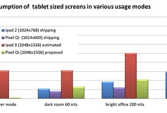 L’entreprise a développé une nouvelle architecture qui a tout du saint Graal : meilleurs contracte, saturation, angle de vue, et une autonomie largement supérieure ! Pour attiser le buzz, Pixel Qi fait connaître à travers un graphique les consommations électriques de cet écran, par-rapport à ceux de l’iPad 2 et 3 :