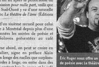 12 avril 2012 : Le poète Éric Roger a obtenu un article dans l’hebdomadaire “La Voix Pop”, au Québec. Ce dernier a publié trois recueils de poésie aux Éditions Dédicaces : “Narcissique dans le bec de l’autruche”, “Admission pour nulle part” et “Le Théâtre de l’Âme” (voir ici). Il anime les soirées Solovox à Montréal depuis plusieurs années…