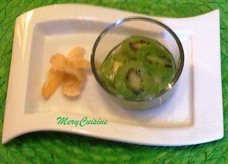 Servir les morceaux de kiwi dans des coupelles, arrosés de leur jus, accompagnés de quelques morceaux de gingembre cristallisé (facultatif)