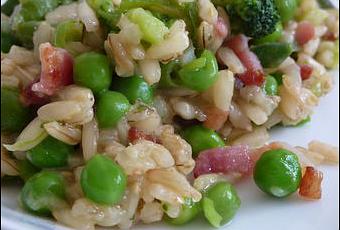 Lorsque le riz est cuit, ajoutez-y les lardons, les légumes et un peu de parmesan. Mélangez et servez de suite, saupoudré de parmesan.