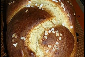 Parsemer de sucre en grains et dorer à l'oeuf la brioche.
