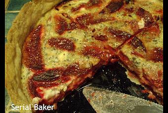 Disposer les oignons, lardons, tranches de betterave et cubes de feta sur la pâte. Verser le mélange oeufs/tofu, égaliser. Saupoudrer de graines de pavot (facultatif, mais ça apporte un peu de croquant).