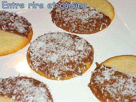 Chez Jenn, j'ai jeté mon dévolu sur les Biarritz, biscuits fins et croustillants nappés de chocolat et saupoudrés de noix de coco. Autant vous dire que ma joyeuse tribu s'est jetée sur ma fournée de Biarritz. Mes biscuits n'ont pas tenu jusqu'à la fin de la journée.