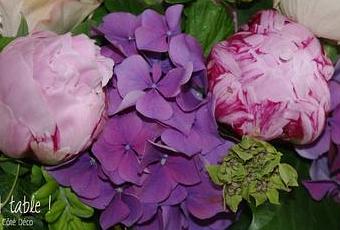 Cette nouvelle table, je la voulais très fleurie...J'ai choisi de la faire avec de belles pivoines (c'est la saison et se sont mes fleurs préférées), mais celles-ci n'étaient pas assez ouvertes, j'ai donc opté de les marier avec des hortensias. L'idée d'utiliser les hortensias m'est venue en regardant la vidéo de Jeff Leathem (un fleuriste qui les adore) Vidéo que vous pouvez voir sur ma page