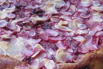 Verser l'appareil sur les fruits, disposer les amandes et enfourner 35mn à 180-200°.
