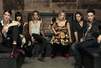 [De gauche à droite : Sam (la fliquette), Saddie (la maîtresse de Frankie dans la saison 1), Frankie, Tess, Cat, Lexie (la petite nouvelle).]Pour mémoire, « Lip Service » est le « L word » écossais. Il s'agit en effet d'une série produite par la BBC, qui évoque les aventures de jolies lesbiennes – d'où le « lip » du titre – à Glasgow. Pour faire une analogie osée, c'est un peu comme si France 2 créait une fiction sur un groupe de gouines à Toulouse (et me demandait logiquement d'écrire le scénario).