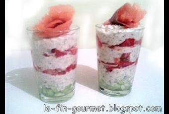 - montez les verrines en commençant par les dés de concombre ; puis ajoutez une couche de tzatziki , une couche de dés de tomate aromatisée puis une deuxième couche de tzatziki et enfin terminez par une belle tranche de saumon fumé .