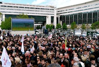 A 14 heures, les deux speakerines du PS, Najat Vallaud-Belkacem et Aurélie Filippetti, arrivent sur scène. Les clameurs qui montent de la foule sont enivrantes. La voix forte de mon voisin de droite l’est beaucoup moins. Mais il parvient à faire reprendre aussitôt les slogans qu’il entame. « On a gagné ! On a gagné ! » s’écrit un jeune derrière moi. « On VA gagner », le corrige une femme d’un ton sec, mais avec un sourire. Dans la clameur ambiante, on ne distingue pas vraiment l’erreur, mais il ne faut pas se tromper.