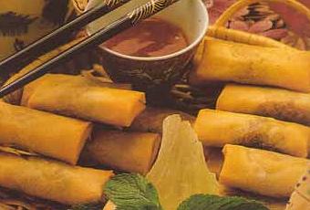 *150 g de champignons chinois, * 1 oignon, * 1 blanc de poireau, * feuilles de salade, * 200 g de porc haché, * 75 g de germe de soja, * 75 g de vermicelle de soja, * 2 œufs, * 1 cuillère à café de sauce au soja, * un peu de glutamate de sodium, * 3 branches de menthe, * 8 galettes de riz, * bain de friture et 1 cuillerée à soupe d’huile, * sel et poivre.