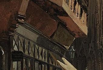 Il y a fort à parier que lorsque Weysser qui, après avoir fait des études scientifiques, a finalement choisi, en 1855, d’être peintre et appris son métier auprès du paysagiste Johann Wilhelm Schirmer (1807-1863) et du portraitiste Ludwig des Coudres (1820-1878) au sein de la toute récemment créée (1854) École des Beaux-Arts du grand-duché de Bade à Karlsruhe, réalise ces deux vues dans une ville de Strasbourg annexée à l’Allemagne à la faveur du traité de Francfort (1871) ayant mis fin à la guerre franco-prussienne, les bruits des chantiers de reconstruction y résonnent encore. Et pourtant, notez comme tout semble tranquille dans les deux scènes qu’il peint. Dans la vue qui présente, dans un effet saisissant de contre-plongée, le rez-de-chaussée et le premier étage de la maison se détachant sur la masse imposante de la cathédrale, dont on aperçoit le portail occidental et un quart de la rose, la flânerie voire la rêverie semblent régner en maîtresses, que seule la femme se tenant sur le seuil de la boutique – serait-ce la veuve Kammerzell à laquelle le bâtiment fut acheté ? – semble ne pas partager. On imagine fort bien que les fillettes se sont arrêtées devant la vitrine pour y admirer les objets qu’elles espèrent se voir offrir un jour ou que le couple qui passe sur le parvis goûte pleinement les délices de la promenade ; même le geste de l’homme à la canne, en habit et haut de forme noirs, qui semble s’adresser à une forme assise que sa position dans l’ombre rend presque imperceptible paraît ne révéler aucune agressivité : serait-il en train de donner en exemple à un mendiant la vie du Christ avant, peut-être, de déposer une pièce dans sa sébile ? Conjuguant à la fois la précision dans le rendu de certains éléments, comme la porte murée ou le soubassement de l’oriel au premier plan, et une touche plus libre au flou parfois presque impressionniste, notable dans des visages à peine esquissés ou dans le rendu des sculptures du portail de la cathédrale, c’est surtout par la maîtrise de la lumière que Weysser impressionne ici ; elle confère, en effet, à la scène les contrastes qui la structurent et l’animent, ainsi que le montre la courbe verticale partant de ce qui semble être une caisse contre le trottoir, passant par l’auvent de la boutique dont le jaune capte et renvoie le soleil qui le baigne, puis par la blancheur des rideaux et enfin par le halo qui baigne la statue dans sa niche.