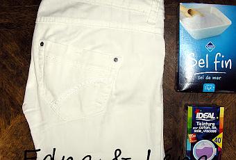 Pour cette fois, j'ai acheté une mini dose de la marque IDÉAL (il existe aussi un grand format), et du sel fin. Pour obtenir la teinte la plus claire, j'ai teint plusieurs vêtements en même temps.