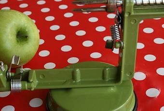 enfoncez la pomme dans le trident et tournez la manivelle jusqu'à ce que la pomme soit pelée