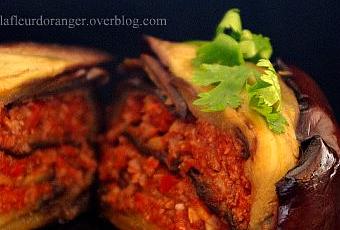 Prendre un moule à gâteau rond ou des ramequins pour des portions individuelles, le badigeonner d'huile, le tapisser de tranches d'aubergine en les laissant dépasser, mettre une couche de la préparation de viande et tomate, une couche de lamelles d'aubergines, une deuxieme couche de viande puis rabattre les abergines pour couvrir le tout.