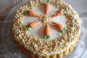 Verser dans l’empreinte du milieu de gâteau, étaler à l’aide d’une spatule et décorer avec des carottes en sucre