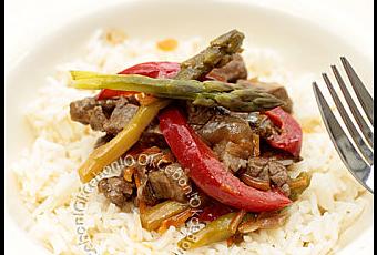 Ajouter la carotte, les asperges et ajouter un verre d'eau, puis au bout d'une minute ajouter les lanières de poivrons. Remuer 2 minutes, jusqu'à ce que les légumes soient légèrement tendres.