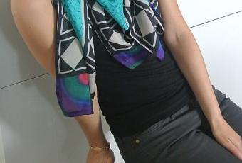 Slim enduit Acquaverde – Débardeur H&M – Foulard Lucy Jay X UO (franges rétirées car l’effet avec n’était pas aussi super que sur les photos du site) – Bracelet Topshop – Bague House Of Harlow – Sac Yvonne Yvonne