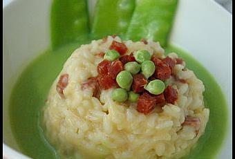 Déposer le risotto au fond d'un plat creux, entourer du velouté et décorer avec les pois et le chorizo restant.