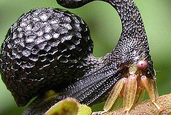 De la famille des Membracidae (une famille d'insectes de l'ordre des hémiptères). Les membracides ont un pronotum (partie dorsale antérieure du thorax) hypertrophié : la fonction de cette excroissance demeure obscure. Selon certains, cette espèce de casque creux pourrait servir de caisse de résonance pour capter les sons émis par d'autres membracides, ou bien il pourrait servir à intimider les prédateurs (ex : ressemblance avec une fourmi en posture d'attaque). Chez certaines espèces, elle semblerait imiter des éléments de l'environnement, assurant par là une fonction de camouflage (Ex : ressemblance avec une déjection d'oiseau, une feuille morte, une épine).