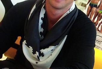 Comme nous le disait Fabien dans son interview, un look sobre : Jean et pull noir de chez Diesel avec des accessoires. Un grand foulard Diesel, une bague "olympique" qu'il a fait réaliser.