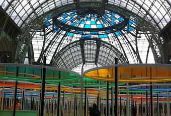 Pour accéder à l'œuvre immersive de Daniel Buren, il faut emprunter un cheminement quasi initiatique. De façon inhabituelle, l'entrée ne se fait pas par la grande porte du Grand Palais, mais sur le flanc Nord, comme si un sas était nécessaire pour se diriger vers ce que l'on perçoit comme un appel de la lumière. "Est-ce que vous rentreriez dans une cathédrale par le chœur ?", interroge l'artiste pour justifier ce changement. Richard Serra, précédent hôte de Monumenta en 2008, en avait eu l'intuition. Pour Daniel Buren, cela s'imposait. Homme de caractère, réalisant ses œuvres comme des tours de force depuis plus de 50 ans, il a su une nouvelle fois se faire entendre. Et toujours, à sa manière. Provocatrice. "Je déteste cette entrée 'pompier', grandiloquente, avec cette lourde colonnade et ses affreux angelots." C'est donc par l'entrée secondaire que le visiteur est invité à pénétrer dans l'antre de ce palais construit en 1897, à l'occasion de l'Exposition Universelle, "un monument consacré par la République à la gloire de l'art français", comme l'indique l'un de ses frontons. Une ironie qui ravit Daniel Buren qui, à 74 ans, continue à s'insurger contre l'art officiel, le système du marché et la glorification sous toutes ses formes.