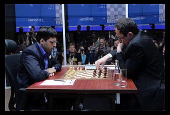 Compte rendu de la 1e partie : La première partie du championnat du monde d’échecs a vu les deux concurrents s’engager dans un combat ouvert. Boris Gelfand a choisi une ouverture inhabituelle pour lui, la Défense Grünfeld, pendant que Viswanathan Anand allait de surprise en surprise, jouant une sous-variante intéressante. Le Challenger réagit de façon radicale : il prit le pion a laissant à ses risques et périls son Roi au centre. Les Noirs déjouèrent toutes les menaces par un jeu précis et forcèrent le passage dans une finale légèrement avantageuse. Cependant, l’évaluation de la position restait plutôt équilibré et quelques coups plus tard les deux adversaires conclurent la nulle. Lors de la conférence de presse, Boris Gelfand attribua sa décision au fait qu’il ne pouvait pas trouver un plan adéquat permettant de lutter pour la victoire.