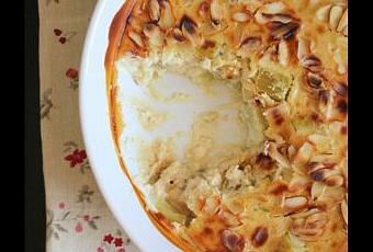 Mixer le reste des ingrédients (sauf les amandes éffilées) et verser sur la rhubarbe.