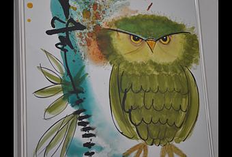 Après le ménage, j'ai accroché mon hibou dans ma pièce fraîchement peinte. Oeuvre originale des années 70 sur aluminium.